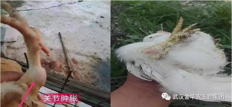 劉姐開始用替米考星加上鹽酸多西環(huán)素用了10天,效果不理想,后來加了4天強力霉素和泰勒菌素,癥狀減輕但是腫脹依舊明顯,出現(xiàn)了越來越多的癱雞,極度消瘦,精神沉郁的病雞。劉姐晚上翻來覆去睡不著,翻閱網上各種資料,后來看到有一個產品叫滑囊藍金”方案還不錯,就抱著試試的態(tài)度在網上找到了華中農業(yè)大學校企合作單位---武漢金華農生物科技有限公司,禽病技術專家姚教授、趙教授確診為滑液囊支原體后推薦劉姐使用滑囊藍金”方案。連用7天一療程。