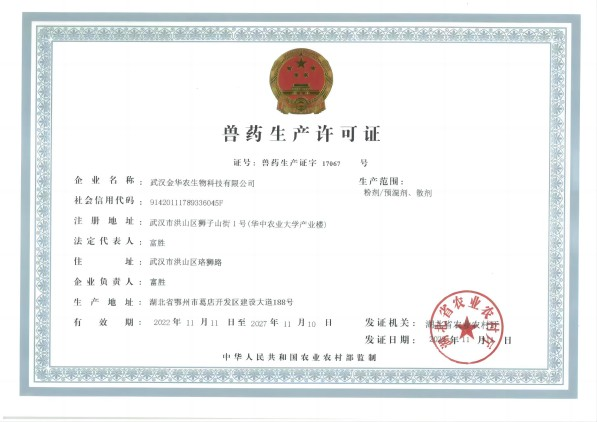 武漢金華農(nóng)獸藥生產(chǎn)許可證號(hào):獸藥生產(chǎn)證字17067號(hào)