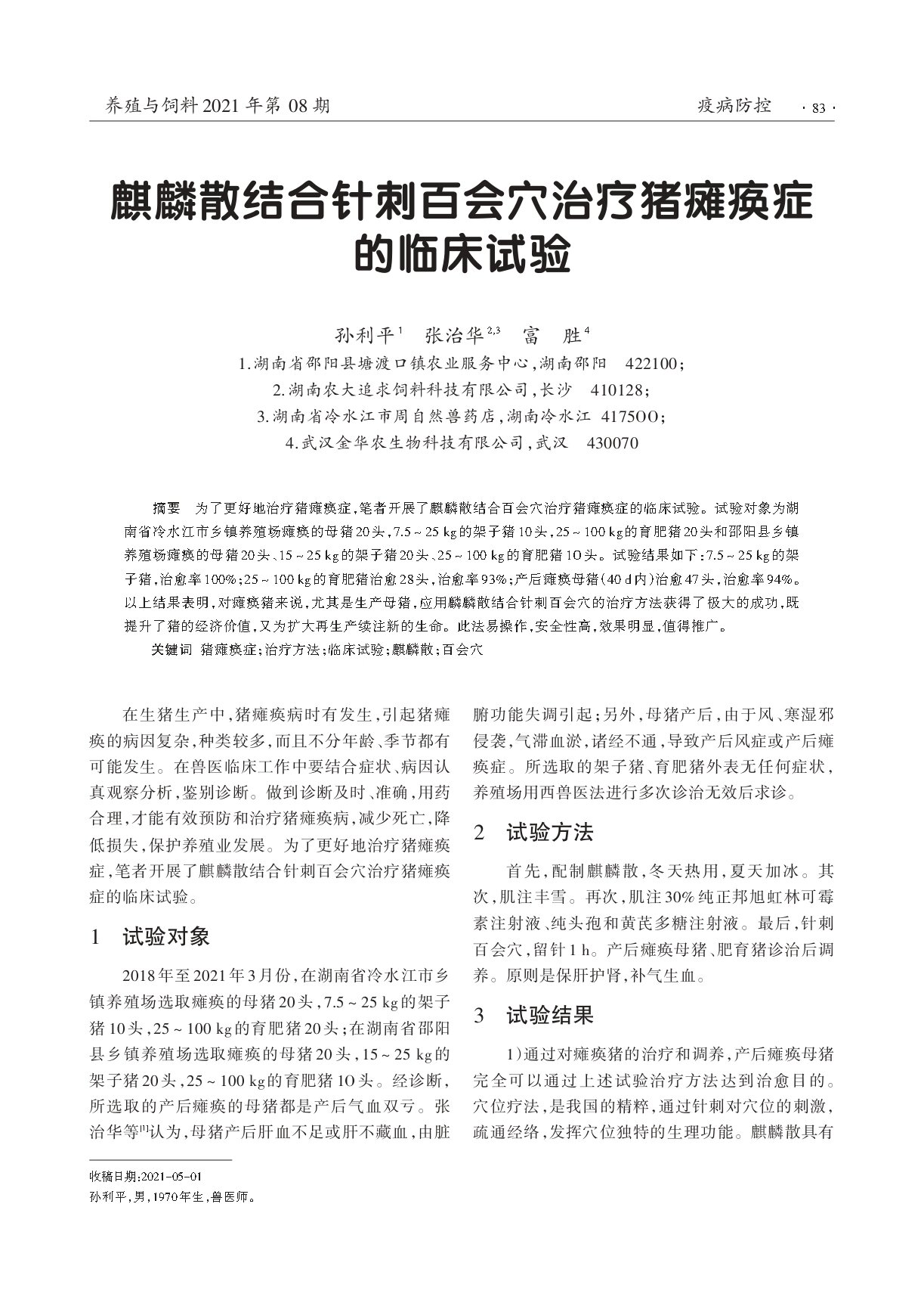 麒麟散結(jié)合針刺百會(huì)穴治療豬癱瘓癥的臨床試驗(yàn)