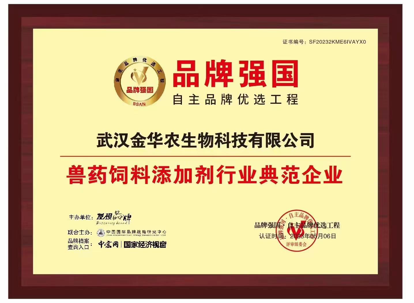 近日,武漢金華農(nóng)生物科技有限公司經(jīng)過資質(zhì)審核、輿情監(jiān)控等層層篩選,成功入選品牌強國·自主品牌優(yōu)選工程,并被評為“獸藥飼料添加劑典范企業(yè)”。企業(yè)信息將錄入品牌強國優(yōu)選工程數(shù)據(jù)庫,在國家級平臺向公眾展示品牌形象。