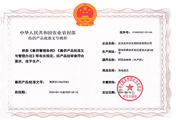 農(nóng)業(yè)農(nóng)村部頒發(fā)我司2個(gè)水產(chǎn)漁藥批文批號(hào)