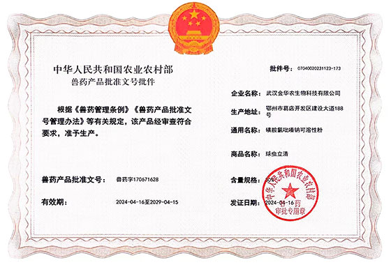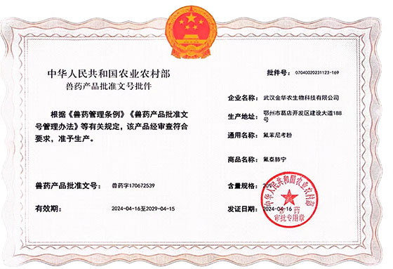 ? ? ? 根據(jù)《獸藥管理條例》和《獸藥產(chǎn)品批準文號管理辦法》的規(guī)定,經(jīng)農(nóng)業(yè)農(nóng)村部審查,準予核發(fā)武漢金華農(nóng)生物科技有限公司2個新版GMP獸藥相關(guān)產(chǎn)品批準文號。